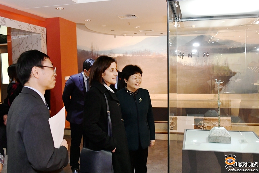 在山东大学博物馆,历史文化学院院长、博物馆馆长方辉教授介绍了山东大学考古学科的发展状况,特别是与特拉维夫大学、希伯来大学、海法大学等多所以色列高校在内的全球合作伙伴在联合考古发掘、学生联合培养等方面的成果。潘绮瑞大使对山东大学博物馆中师生考古发掘文物占比超九成表示震撼,她高度评价了山大国际化人才培养和合作研究促进学科发展的模式,希望高校在推动多文化理解和交流中发挥更大作用。