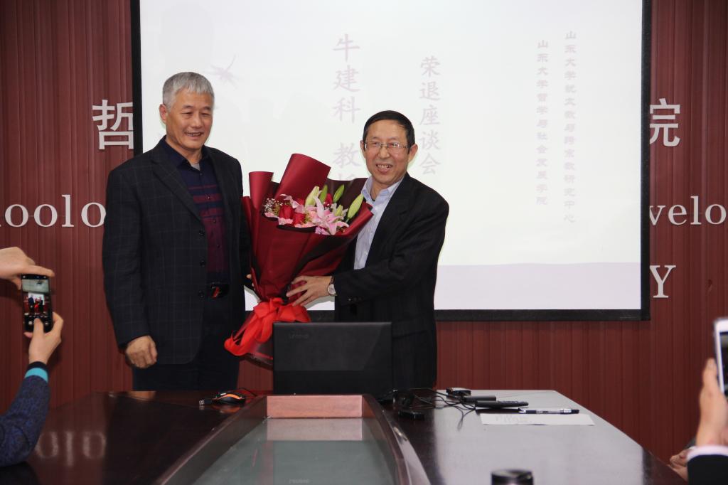 座谈会中,郑倩对牛建科教授多年来为学院学术研究及人才培养所作出的贡献表示衷心的感谢。他表示,牛建科教授在学院多年,一直以敬业的学术精神与积极乐观的生活态度影响着身边的每一位同事及学生,是见证了学院发展,并作出突出贡献的教师。傅有德教授对牛建科教授的荣退表示了衷心的祝愿。荣退是职业工作生涯的结束,但更是一段新生活的开始,在这段期间可以有更多的时间享受生活。