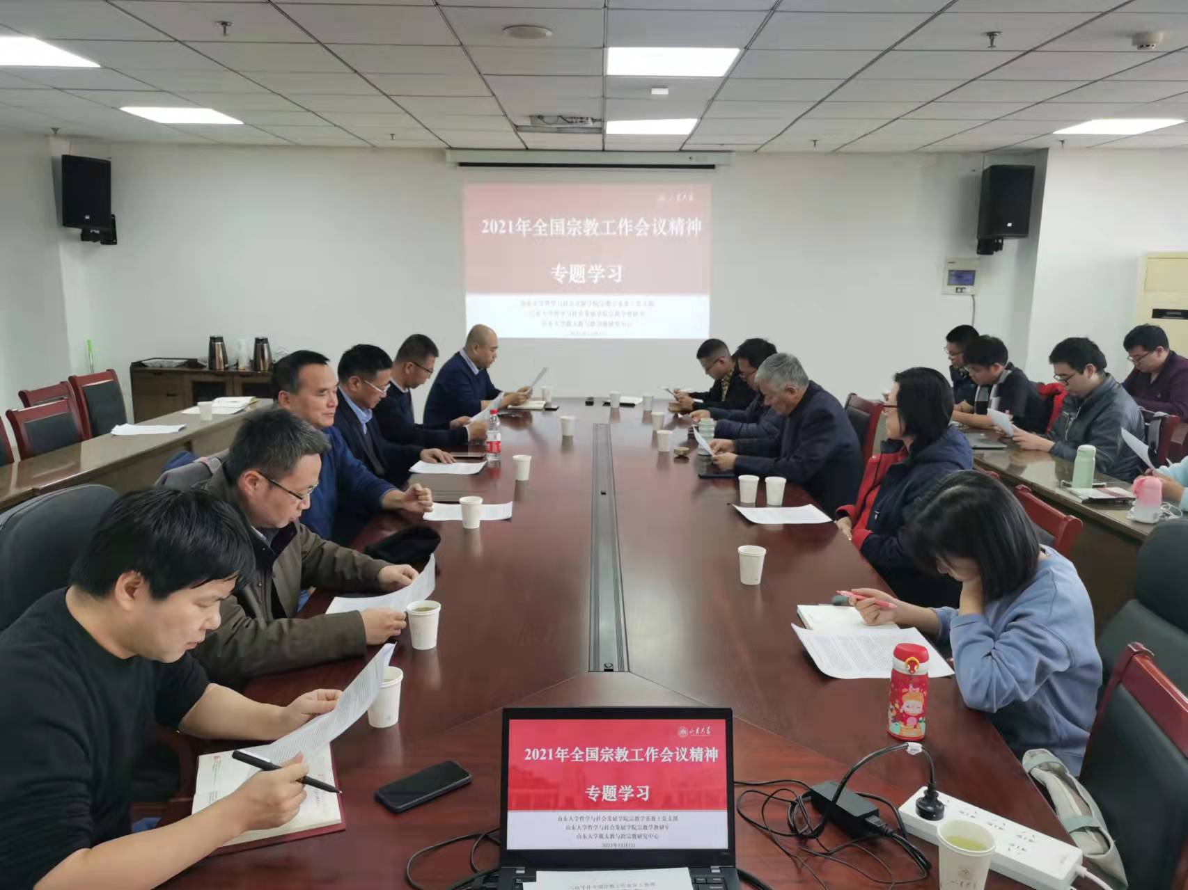 12月7日,哲学与社会发展学院宗教学系教工党支部、宗教学教研室、教育部人文社会科学重点基地山东大学犹太教与跨宗教研究中心联合举办“学习全国宗教工作会议精神”专题学习会。犹太教与跨宗教研究中心主任傅有德教授,哲学与社会发展学院副院长、宗教学系主任陈坚教授,刘新利教授等宗教学系全体教师以及部分学生代表参加会议。
