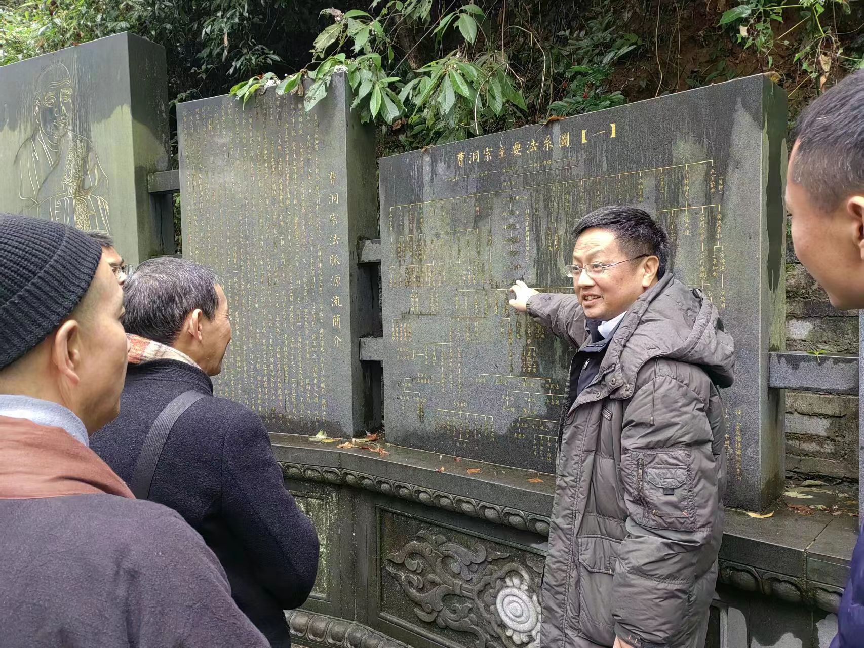 15日下午,团队前往洞山普利禅寺交流参观。洞山普利禅寺是禅宗五家七宗中最有影响力、兼容儒释道三教的曹洞宗的祖庭,亦是佛教中国化影响宗教建筑的力证。陈坚教授对照着寺庙中石碑的文字现场授课,介绍曹洞宗的宗派源流和主要法系,引导大家理解融合儒道的禅宗哲学。