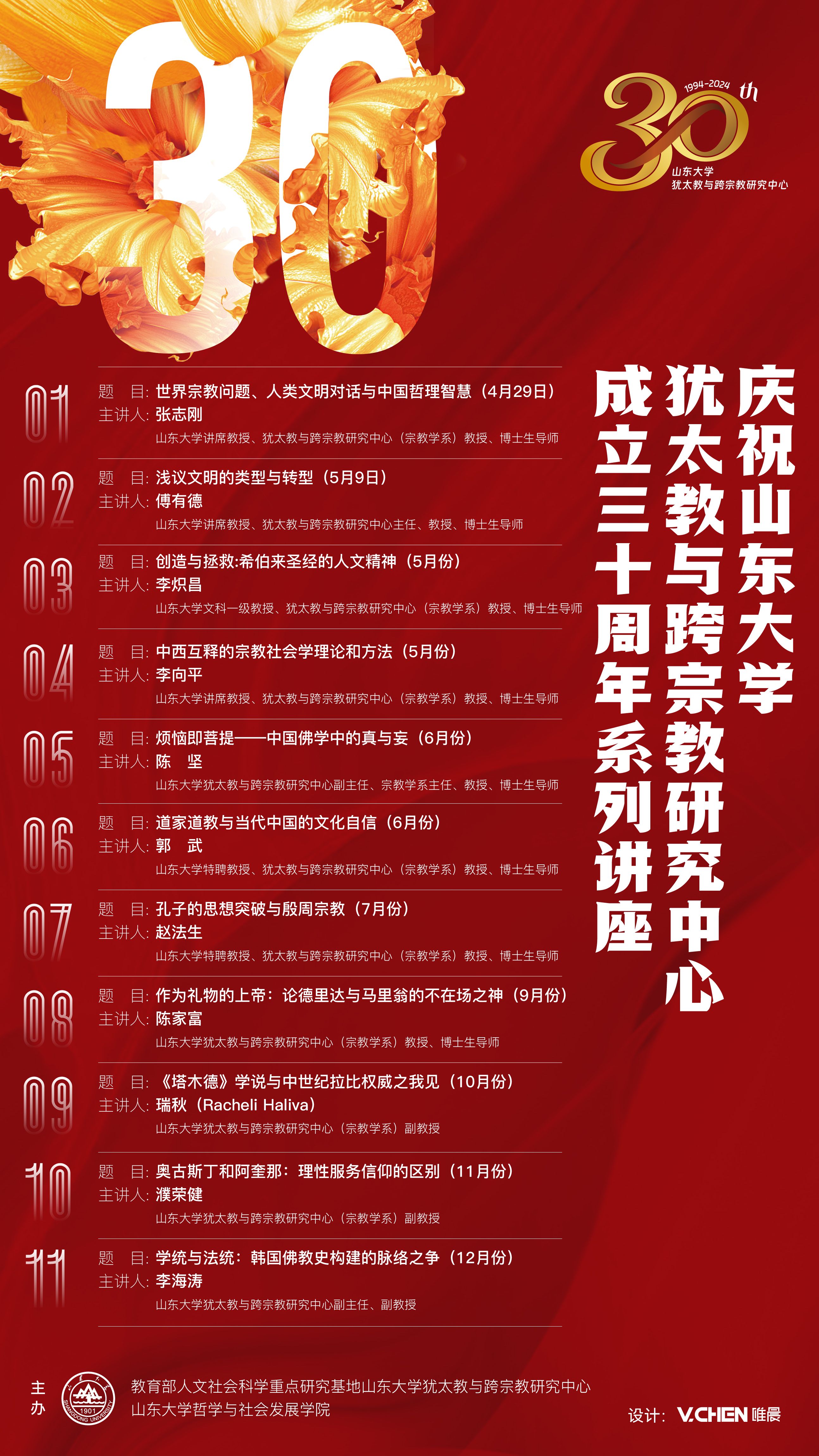 1994年,傅有德教授创办了“山东大学犹太文化研究所”,这是国内高校较早成立的犹太研究机构之一。山东大学的犹太研究自此正式拉开序幕。2003年,以“犹太文化研究所”为主体,组建成立“山东大学犹太教与跨宗教研究中心”,该中心于2004年入选教育部人文社会科学重点研究基地。值此成立30周年之际,本中心隆重推出11讲系列讲座,主讲人均为中心成员。具体讲座信息将及时在本网站和基地公众号发布,敬请关注。