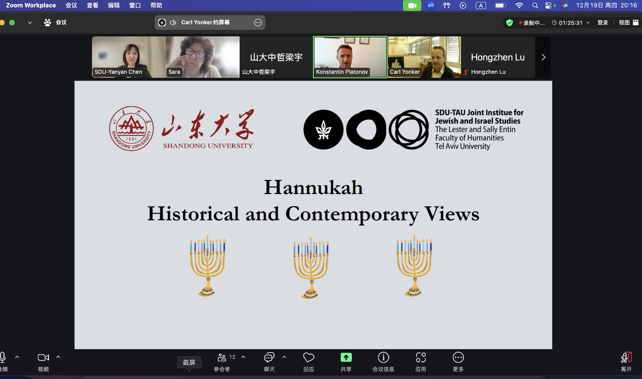 12月19日晚,山东大学犹太教与跨宗教研究中心、山东大学-特拉维夫大学犹太与以色列联合研究所举办“Hannukkah:HistoricalandContemporary Views”专题讲座?;疃ü齔oom进行,聚焦犹太教光明节(Hanukkah)这一传统节日,从历史、传统到现代文化的多个维度展开讨论,探讨该节日在不同社会背景下的深远意义。