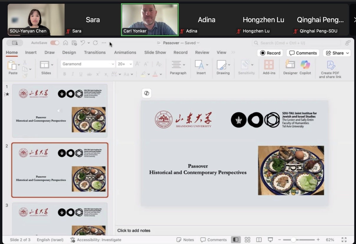 4月1日,山东大学—特拉维夫大学犹太与以色列联合研究所成功举办了一场主题为“逾越节:历史渊源与当代视角”(Passover: Historical and Contemporary Perspectives)的专题讲座。本次讲座邀请到特拉维夫大学Uriya Shavit、Sara Zalcberg、Carl Yonker三位学者,分别就逾越节的历史背景与重要意义、神话与现实维度、逾越节与基督教复活节的关系进行了深入探讨。讲座由山东大学犹太教与跨宗教研究中心助理研究员陈艳艳主持。