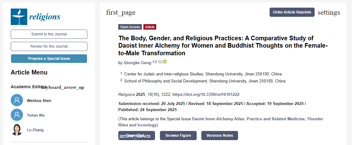 近日,犹太教与跨宗教研究中心博士后耿琼珂在国际著名学术期刊Religions(A&HCI)发表研究论文,题目为“The Body, Gender, and Religious Practices: A Comparative Study of Daoist Inner Alchemy for Women and Buddhist Thoughts on the Female-to-Male Transformation”。该文发表在 Religions 2025年第16卷第10期。