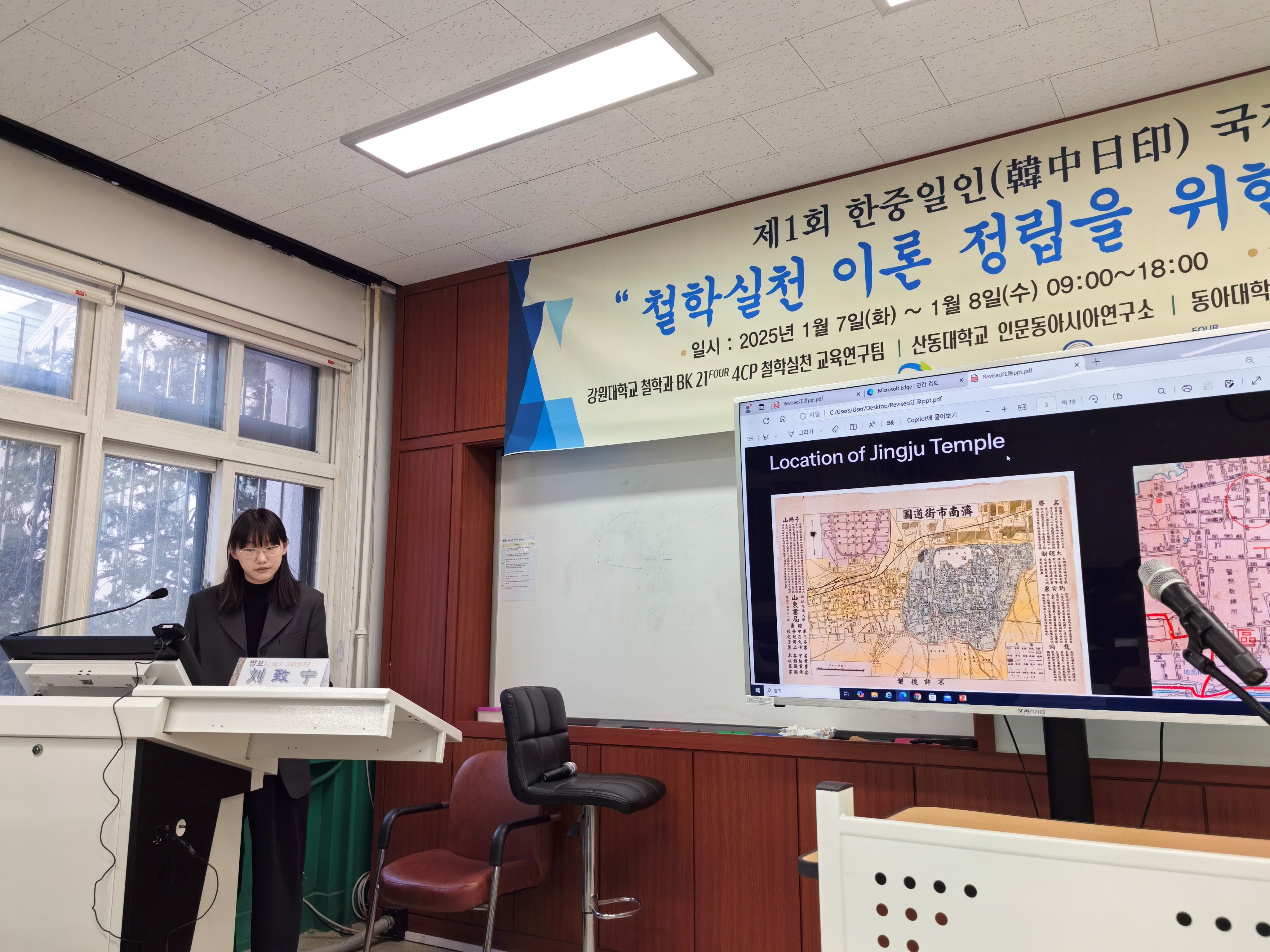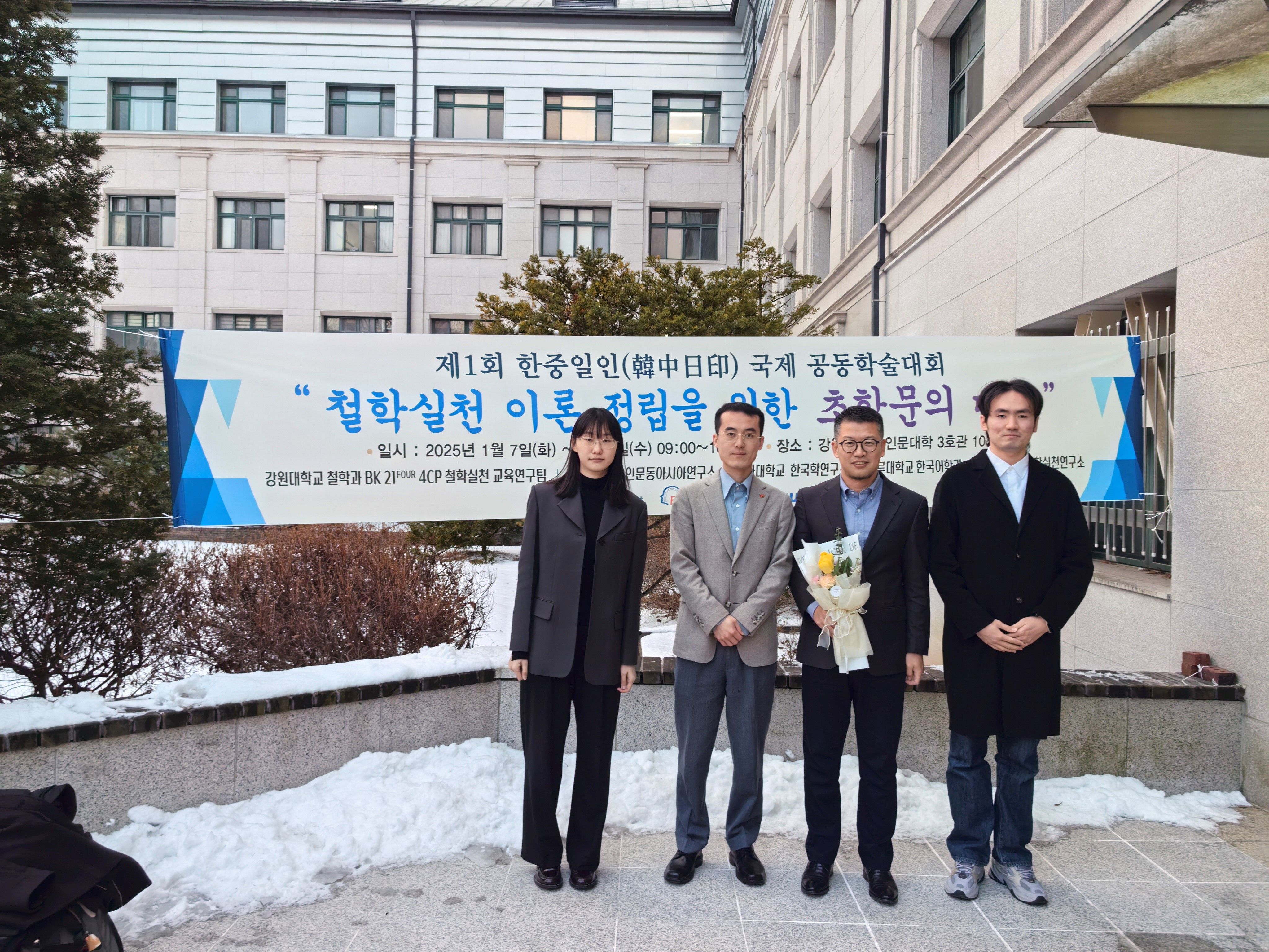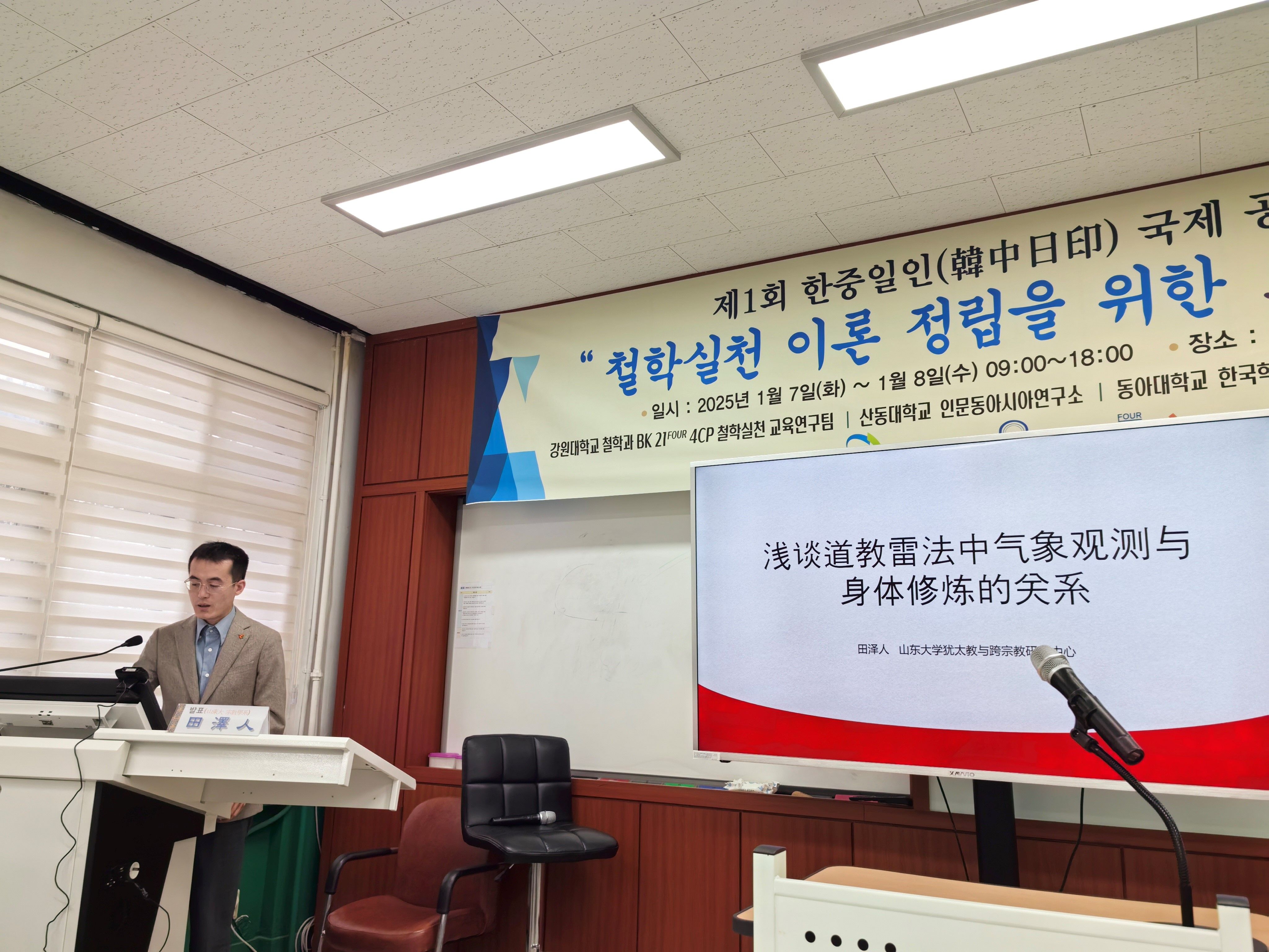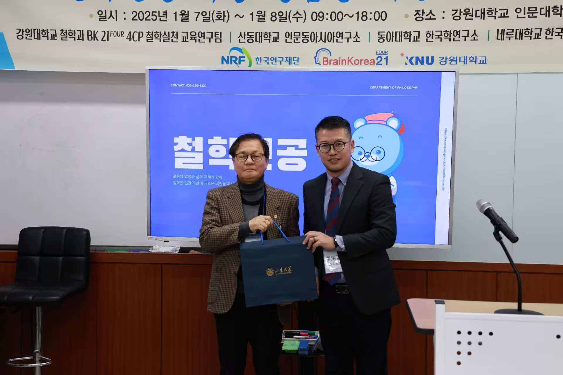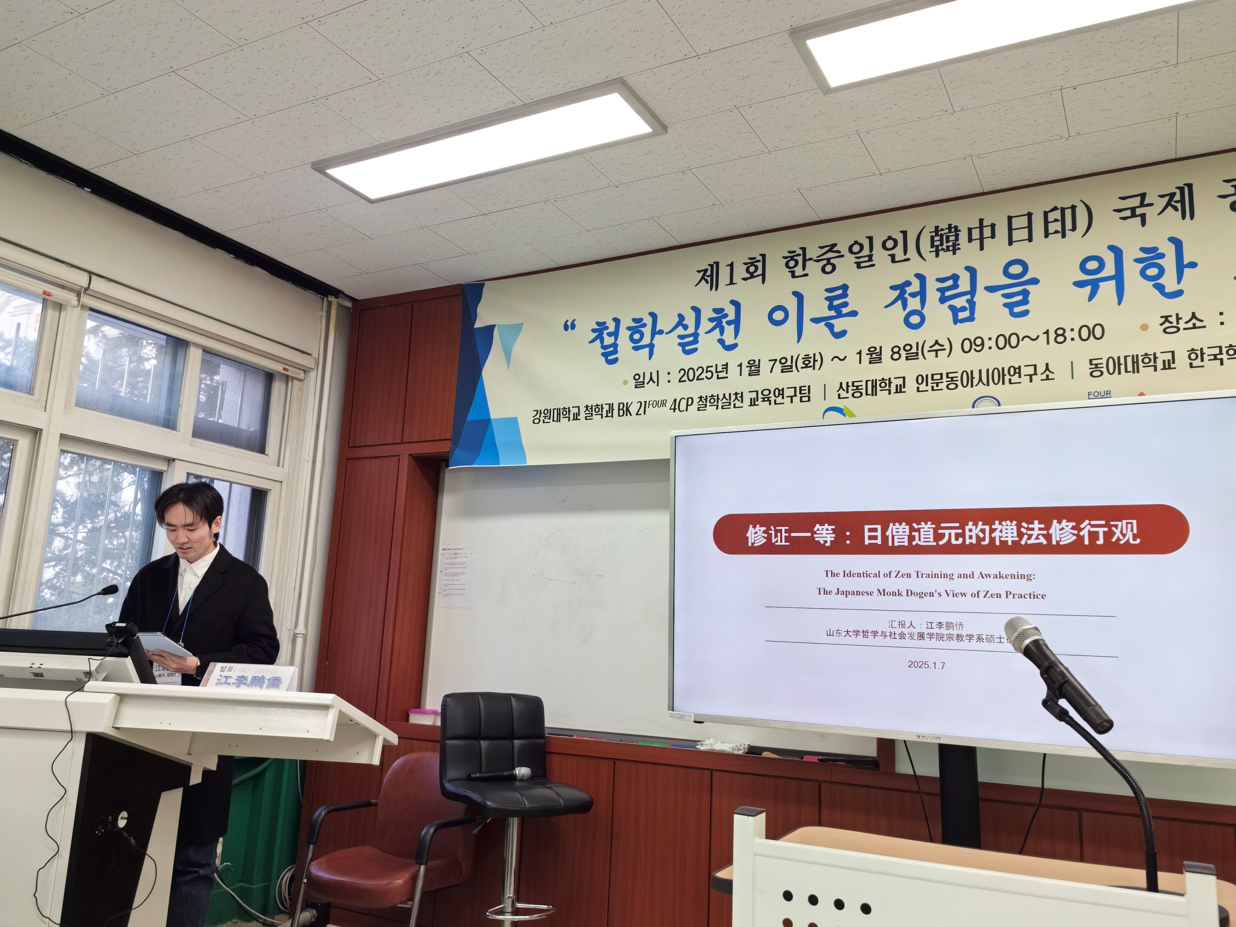 2025年1月6日至9日,山东大学犹太教与跨宗教研究中心副主任李海涛副教授受邀率团访问韩国国立江原大学,参加第一届国际哲学实践会议(The International Conference on Philosophical Practice)。本次会议主题为“Transdisciplinary Dialogue for Establishing Philosophical Practice(建立哲学实践的跨学科对话)”。会议旨在将东亚儒·释·道、中西哲学比较研究的讨论,推进至哲学的实践与应用层面。犹太教与跨宗教研究中心/宗教学系博士研究生田泽人,硕士研究生江李鹏侨、刘致宁一同参会并发表学术论文。